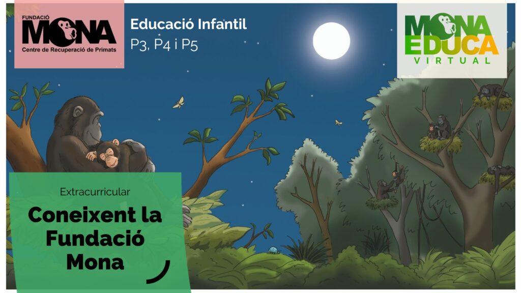 En aquesta activitat virtual, explicarem les problemàtiques que afecten als primats de forma didàctica, motivadora, innovadora i entretinguda, a través del Conte d’en Bongo i d’imatges en directe del propi Bongo i la seva família. Al mateix temps ens endinsarem a la Fundació MONA i coneixerem els altres primats que viuen en ella i la feina que s’hi fa.