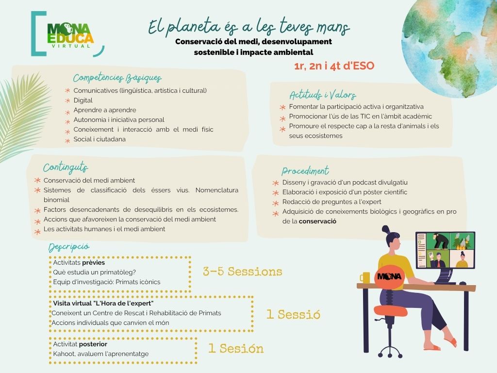 Visita virtual per videoconferència amb l’expert, amb material audiovisual i imatges en directe dels primats rescatats per MONA.