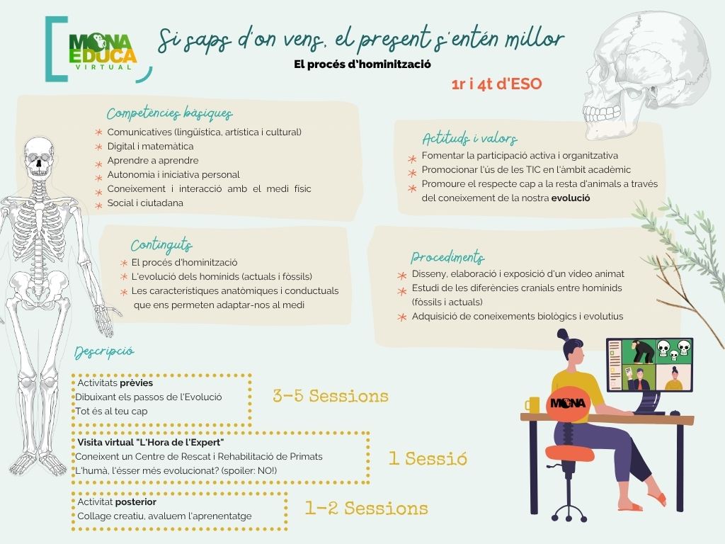 A través de les activitats prèvies, l’Hora de l’Expert i les activitats posteriors, es desenvoluparan coneixements sobre el procés d’hominització, amb l’objectiu de trencar amb la idea de superioritat evolutiva que encara avui predomina en molts sectors de la nostra societat.
