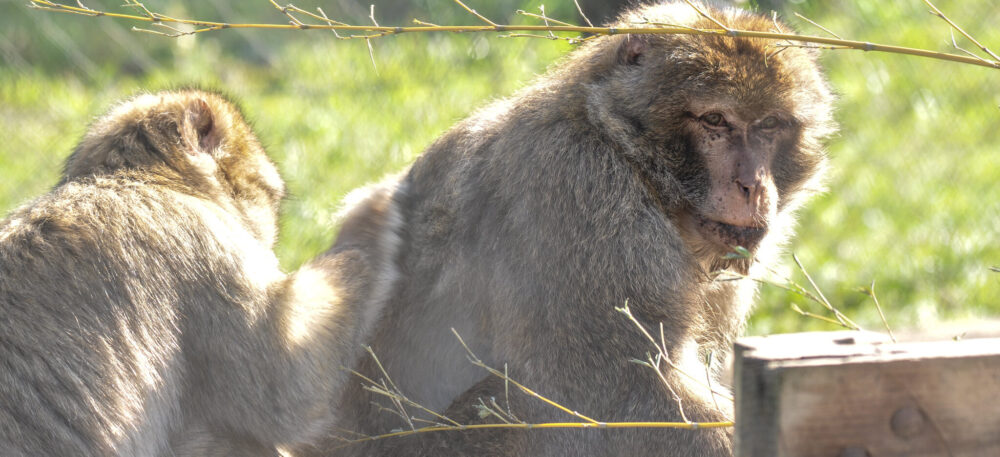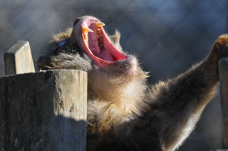 De vez en cuando podemos ver que ocurre por momentos difíciles. Cuando se encuentra estresado, es frecuente verle amenazando y atacando su propio pie o brazo. Esta conducta de autoagresión es típica en macacos que no están equilibrados porque tienen carencias sociales, derivadas de la criba de la madre de pequeños y del grupo familiar. En cuanto a su aspecto físico, ha cambiado mucho. Hace tiempo que se ha convertido en un macho adulto, y tiene un aspecto y unos colmillos imponentes.
