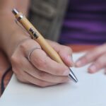 Bolígraf de bambú amb detalls platejats que inclou el logotip de Fundació MONA en el seu disseny.