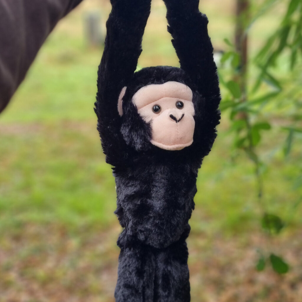 Aquest peluix representa un ximpanzé i té velcro a les mans i als peus. Està fet a mà amb un material suau.